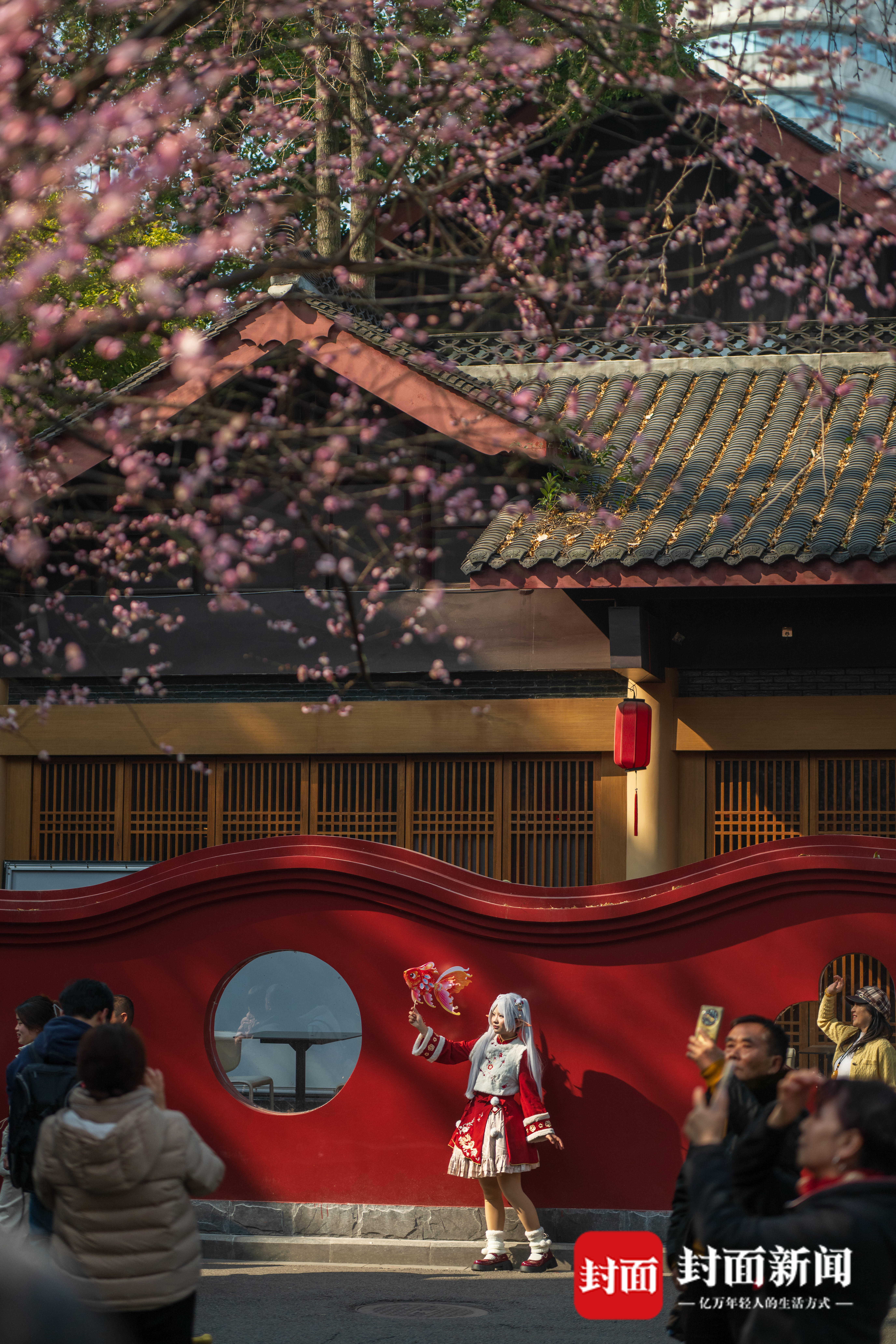 1月15日,成都青羊宫,粉梅绽放,红墙下站满了前来拍照打卡的市民。