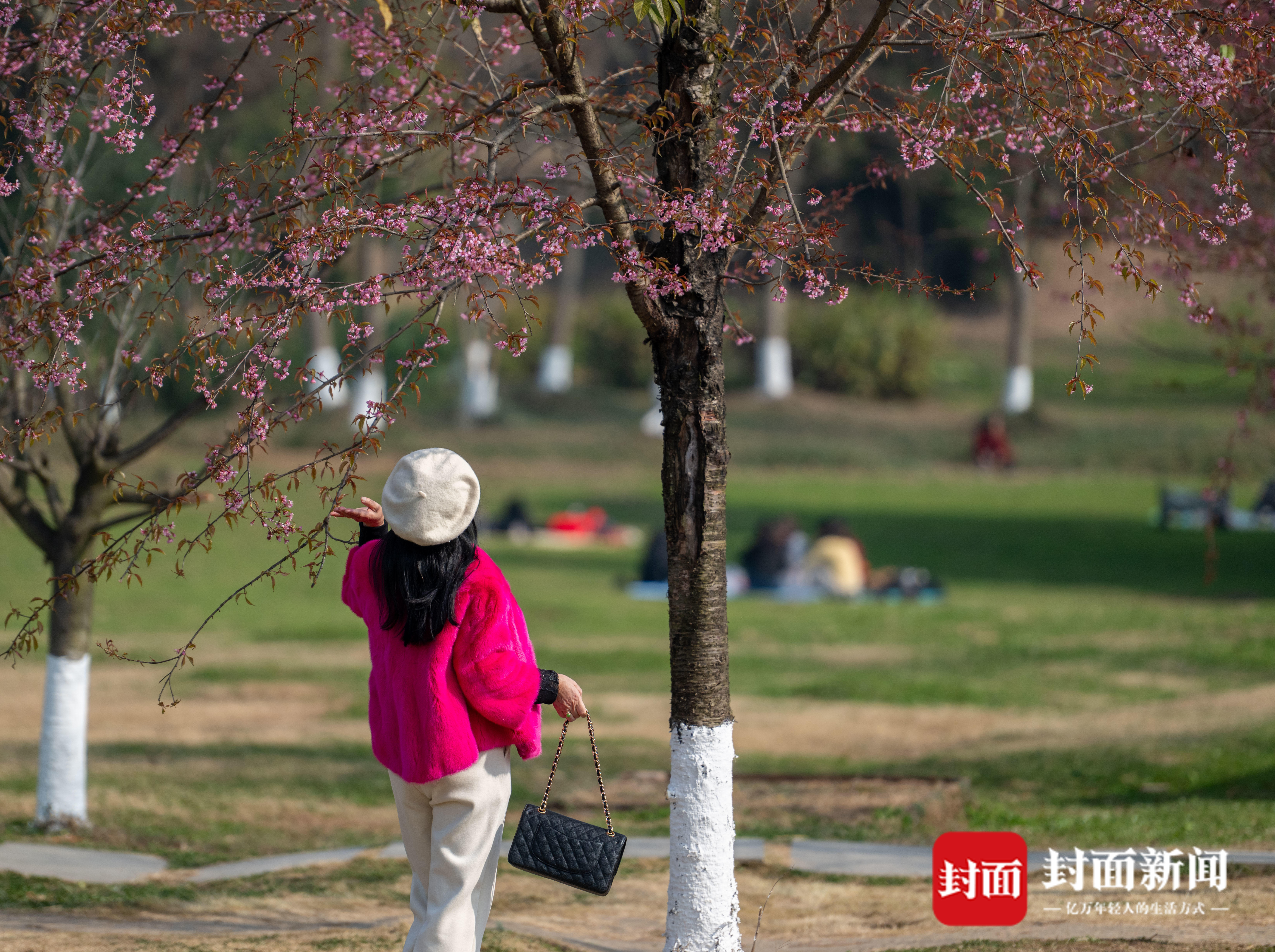 1月15日,成都青龙湖湿地公园,粉色冬樱进入盛花期,市民们前来拍照打卡。