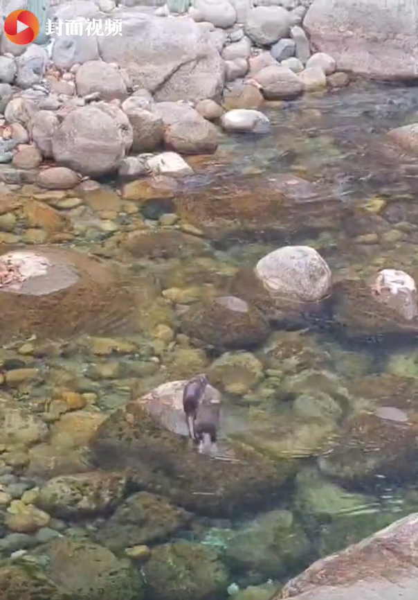 据拍摄者、片区信息中心职工杨贵平介绍,当时巡护队伍沿河岸向上游行进,发现河中两只水獭正在觅食。起初水獭在水中数次尝试捕食均未成功,随后登上岸边石块短暂休整,再度入水后沿河道向上游游动,最终成功捕获一只类似青蛙的猎物,在水中从容啃食,整套动作娴熟流畅,尽显 “水中猎手” 的本色。